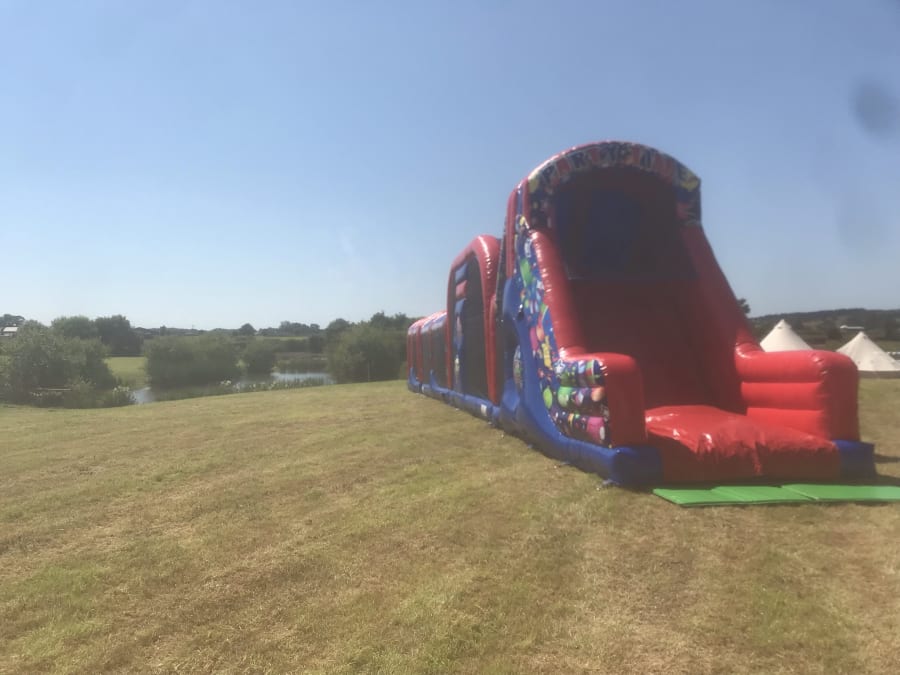 The obstacle course is suitable for all ages including adults!! It features numerous challenges to take on with a huge base jump and a 10ft platform slide.