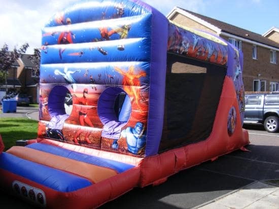 Introducing our superheroes fun run, 30 feet of pure fun, great for the younger children as well as the older ones as this has netted sides to keep the small ones safe. Onto the step, through the holes and onto the bed where they can bounce and play with the biff bash pillars before they climb up the steps and down the slide, then it's back to the start to begin all over again.