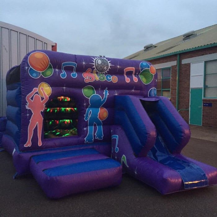 Introducing our fantastic front slide disco bouncy castle, perfect for younger children who can bounce and slide to their favourite songs. Built in the UK this disco combi bouncy castle features vivid artwork and an enclosed bouncing space which highlight the bright disco lights, simply connect your phone via Bluetooth to play your chosen hits.